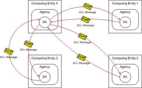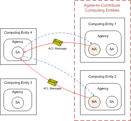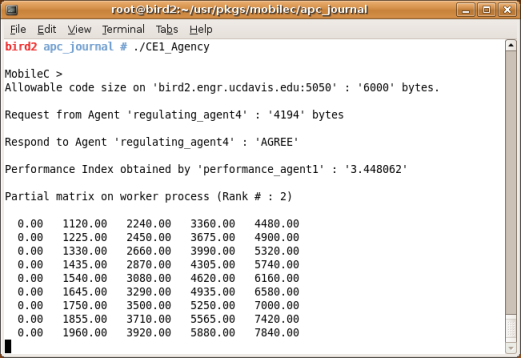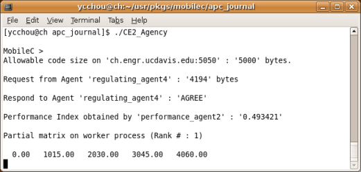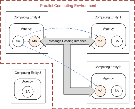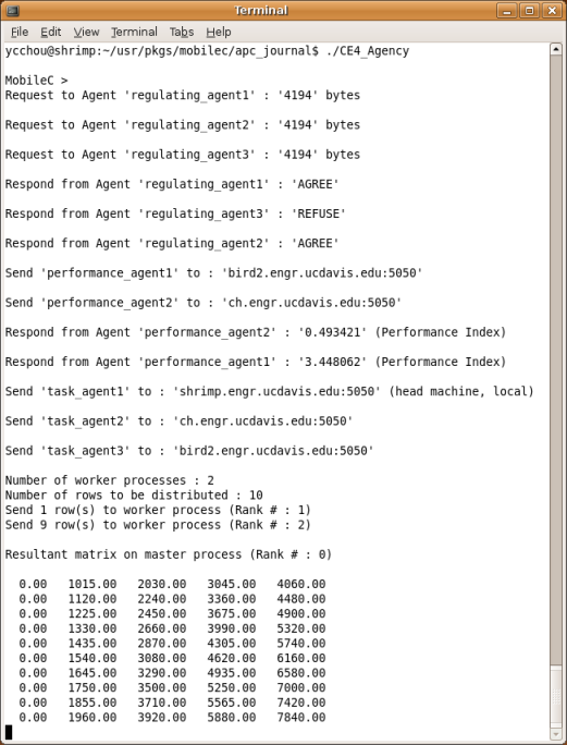 There are four computing entities, each of which is a Linux machine, involved in this simulation. One of the four computing entities autonomically forms a parallel computing environment consisting of itself and other computing entities that agree to contribute their resources. Four agencies, CE1_Agency, CE2_Agency, CE3_Agency, and CE4_Agency, represent the agencies running on computing entities, Computing Entity 1, Computing Entity 2, Computing Entity 3, and Computing Entity 4, respectively. The hostname of Computing Entity 1, Computing Entity 2, Computing Entity 3, and Computing Entity 4 are bird2, ch, phoenix, and shrimp, respectively. In addition, four agents, regulating_agent1, regulating_agent2, regulating_agent3, and regulating_agent4, represent the stationary agents running on agencies, CE1_Agency, CE2_Agency, CE3_Agency, and CE4_Agency, respectively.
