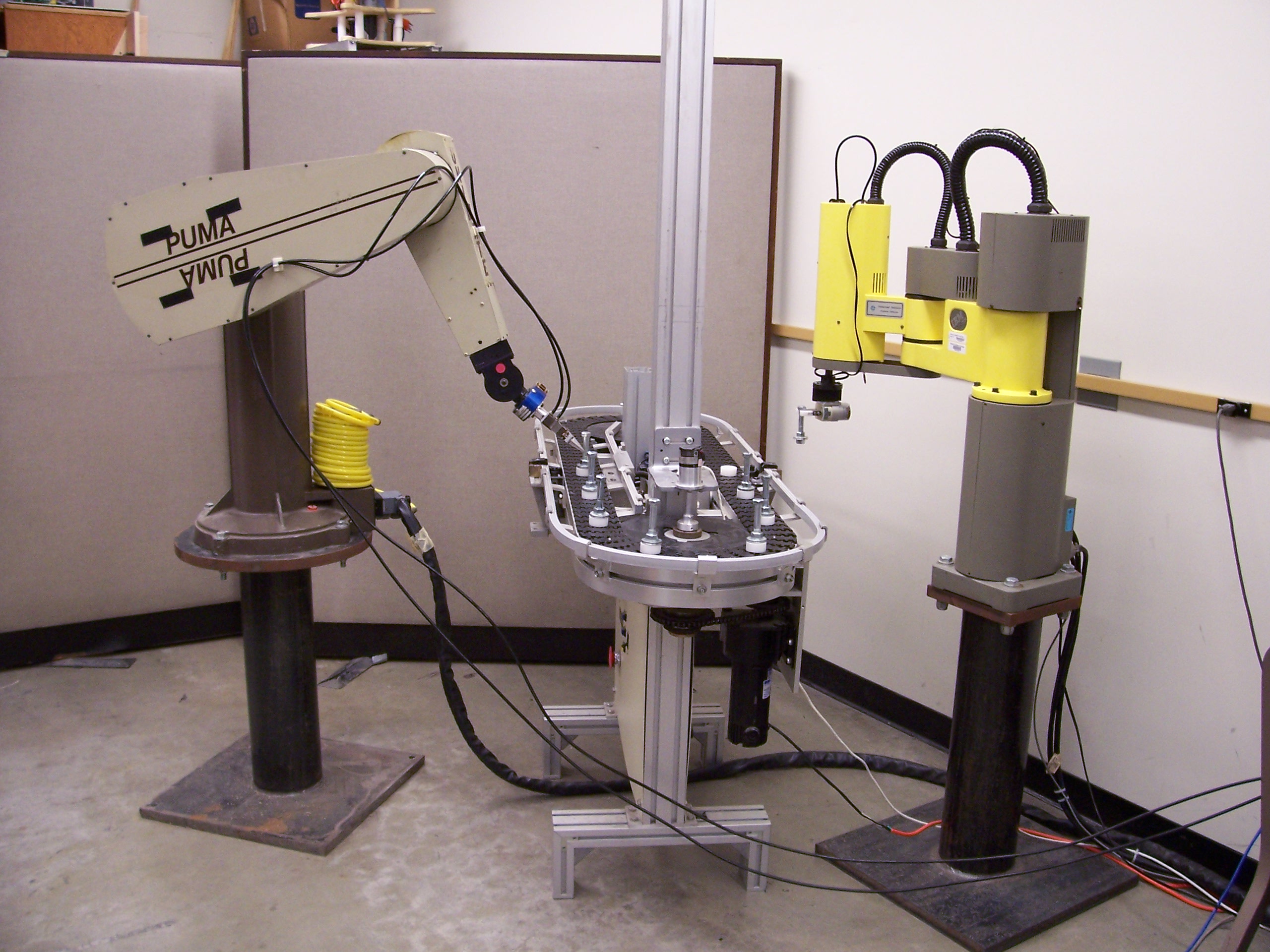 When the robot cell is started, the two robots and the conveyor system are moved to their ready position after initialization and are calibrated. Then, the IBM 7575 robot is used to pickup parts from a designated location and place the parts on the conveyor system. Once a part has been placed, the conveyor system will rotate. As the conveyor is rotating into its preset position, the IBM 7575 will then move back to the designated pickup location while the Puma 560 moves to pickup a part from the conveyor. After the Puma 560 has picked up a part, it moves to a drop off location and positions the piece. This is accomplished by calculating the initial and final positions of motion for the two robots. The assembly cycle simulates the assembly procedure of a part. Once a part has gone through its initial stages of manufacturing, it is placed on a conveyor system and brought to either the next stage in fabrication or packaging. The motion of the robots are synchronized to ensure that a robot is fully stopped before proceeding with the next control command. VideoClick on the links below to download a video of the robot cell in action. 5x Normal Speed