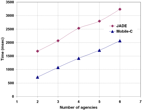 The agent mobility of a mobile agent platform is relevant to and affected by the agent migration performance of that platform. The performance of agent migration is specifically important to applications with a large number of mobile agents. Here presents performance comparison of agent migration for Mobile-C and JADE using three essential benchmark tests originally proposed for JADE. Each of the three experiments simulates a relay-race. Interactions between any two runner agents in the same team are accomplished by exchanging ACL messages. A homogeneous environment is set up to perform the tests. The environment consists of four identical Linux machines. Each machine has an Intel Pentium 4 processor running at 3.2 GHz and 512 Mb of RAM. All these machines are connected through a switch with a 100 Mbits/s transmission rate. Test 1: Four agent teams with different numbers of agenciesThe first test is where four agent teams migrate among different numbers of agencies. The number of agencies ranges from two to six. For situations where there are two to four agencies, each machine has one agency running on it. For situations where there are five and six agencies, there are two machines that have two agencies running on them. The migration routes for five and six agencies are set up in a way that no agents will migrate between two agencies running on the same machine. Each team has one trigger agent and the same number of runner agents as that of agencies. For each team, at the beginning, each runner agent stands by on each agency. The trigger agent is then sent to the first agency to signal the runner agent to start the relay-race. The trigger agent becomes another runner agent once it signals the runner agent to depart from the first agency. In order to make all the runner agents leave the first agency almost simultaneously, a trigger agent does not signal its runner agent until all the other trigger agents arrive the first agency. Each team is considered to complete one lap when the runner agent on the last agency arrives the first agency. A total of five laps need to be completed by each team. The moment when all the trigger agents arrive the first agency to start the first lap is recorded as the start time. The moment when all the runner agents on the last agency arrive the first agency to complete the fifth lap is recorded as the stop time. A migration time is calculated as the interval between the start time and stop time. Figure 1 shows the migration times of Mobile-C and JADE for test 1. Each migration time is obtained by averaging 20 migration results. The migration times of Mobile-C are about 42.55%, 51.96%, 55.96%, 61.35%, and 63.79% of the corresponding ones of JADE for two to six agencies. The results also show that the performance of Mobile-C is more linear than JADE.