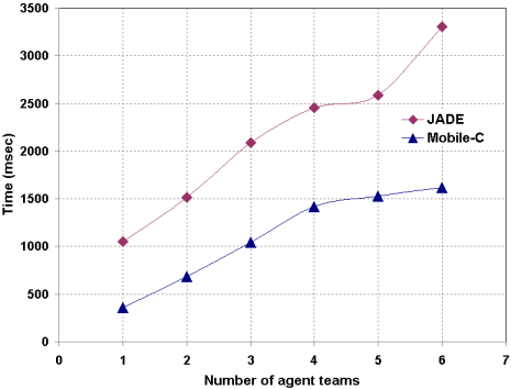 Figure 1: Migration times for four agent teams with different numbers of agencies. Test 2: Four agencies with different numbers of agent teams The second test is where different numbers of agent teams migrate among four agencies. The number of agent teams ranges from one to six. Each machine has one agency running on it. Each team has one trigger agent and four runner agents. The methods for starting the relay-race and calculating a migration time are the same as those in test 1. Figure 2 shows the migration times of Mobile-C and JADE for test 2. Each migration time is obtained by averaging twenty migration results. The migration times of Mobile-C are calculated to be 34.61%, 45.24%, 50.02%, 57.73%, 58.9%, and 48.94% of the corresponding ones of JADE for one to six agent teams.