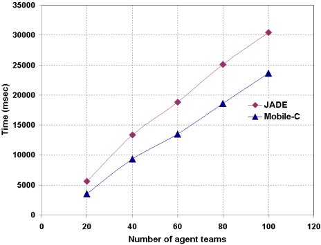 Figure 2: Migration times for four agencies with different numbers of agent teams. Test 3: Four agencies with large numbers of agent teams The third test is the same as test 2 except that large numbers of agent teams are involved in the relay-race. The numbers of agent teams in test 3 are 20, 40, 60, 80, and 100. Each machine has one agency running on it. Each team has one trigger agent and four runner agents. The methods for starting the relay-race and calculating a migration time are the same as those in test 1. Figure 3 shows the migration times of Mobile-C and JADE for test 3. Each migration time is obtained by averaging twenty migration results. The migration times of Mobile-C are calculated to be 62.46%, 69.87%, 71.8%, 74.01%, and 77.82% of the corresponding ones of JADE for 20 to 100 agent teams.
