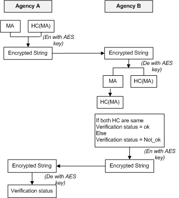 At the end, it shows an integrity check in which agency B compares two hash codes.